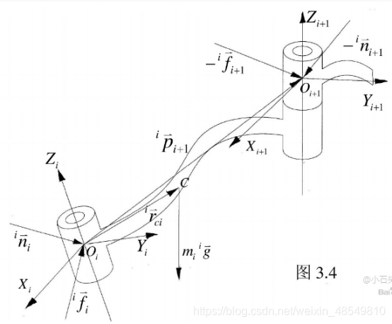 由机器人建立坐标系规则以及坐标系变换可知,坐标系oxyz-i经过绕xi旋转,沿xi平移,绕zi+1旋转,沿zi+1平移得到坐标系oxyz-i+1.总之经过除绕zi+1旋转外还绕xi旋转。另外oxyz-i坐标系与连杆i固连,oxyz-i+1坐标系与连杆i+1固连,因而坐标系角速度就为相应连杆角速度。